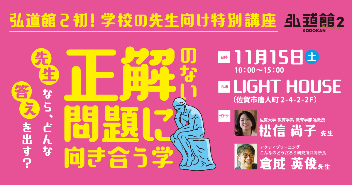 教育現場でこれまで500人以上の子どもたちと向き合い、現在は佐賀大学にて未来の先生を育ててらっしゃる松信尚子先生。そして、アクティブラーニングこんなのどうだろう研究所所長として、学校や企業研修でこの手の問題を多数考案&実践してきた倉成英俊氏。この2人がタッグを組み、正解のない問題を出題しファシリテート、一緒に議論します。