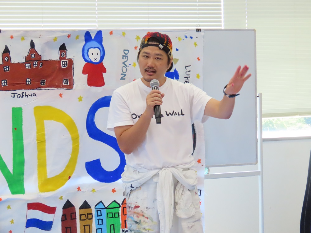 弘道館2で、オランダに届ける絵を子どもたちと一緒に描くことになったのは、日本とオランダの交流425年を記念して、ミヤケンさんによる壁画プロジェクトが決定したこと。オランダにある焼き物の街、デルフトにある団地の建物に壁画を描くことになっています。佐賀県内の高校生3名も、夏休みを利用してオランダに渡り、壁画プロジェクトに参加します。高校生たちは、子どもたちの作業をサポートするため、今回の講座にもかけつけてくれました。