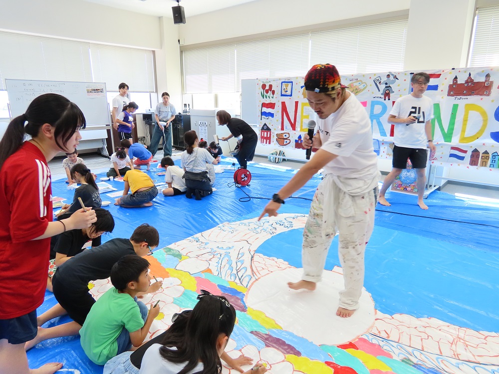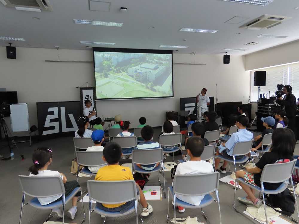 今回は、子どもたちのための特別講座「絵で世界とつながる学」です。講師にお迎えしたのは、アーティストのミヤザキケンスケさん(通称ミヤケンさん)。夏休みにあわせて、「オランダに届ける作品を一緒に描こうよ!」と呼び掛けたところ、なんと300名以上の応募があり、過去最高の倍率の中で選ばれた小学生25名が参加してくれました。会場には、絵を描くのが好きな子、海外に興味がある子などが集まり、始まる前からワクワク感が伝わってきます。