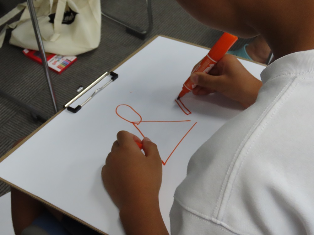それでは、お楽しみのお絵描きタイム!といきたいところですが、まずはウォーミングアップで、「オンリーワンゲーム」にチャレンジです。「春といえば?」、「三角形のものといえば?」など、テーマにあわせて1分間で絵を描き、他の人とかぶらないオンリーワンを目指すというゲーム。春といえば、「おたまじゃくし」「桜もち」、三角といえば、「三角チョコパイ」「ショートケーキ」など、ユニークなオンリーワンが次々出てきて、会場は一気にリラックスしたムードに。「人と違うことは素晴らしい。絵は、人と違っていればいるほど魅力的になる」というミヤケンさんの言葉が印象的でした。