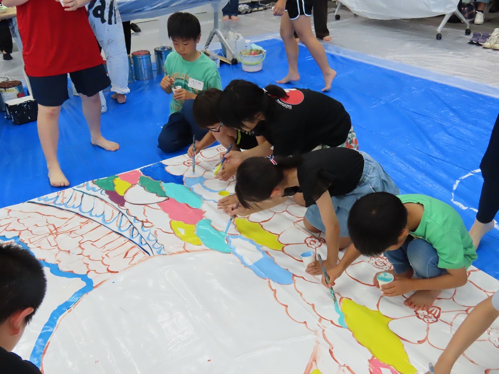 さあ、ここからは集中モードで、みんな裸足になって絵を描いていきます!使用するのは水性ペンキ。描くモチーフは、有田焼とデルフト焼、デルフト市民のルーツに関わる花、オランダの人たちに愛されている葛飾北斎の冨嶽三十六景をイメージしたものに、ミヤケンさんが必ず作品に入れるという太陽やバルーンなどをコラージュしたもの。用意された下絵をもとに、チーム分けされた子どもたちが、思い思いの色を片手に約2時間かけて描いていきました。