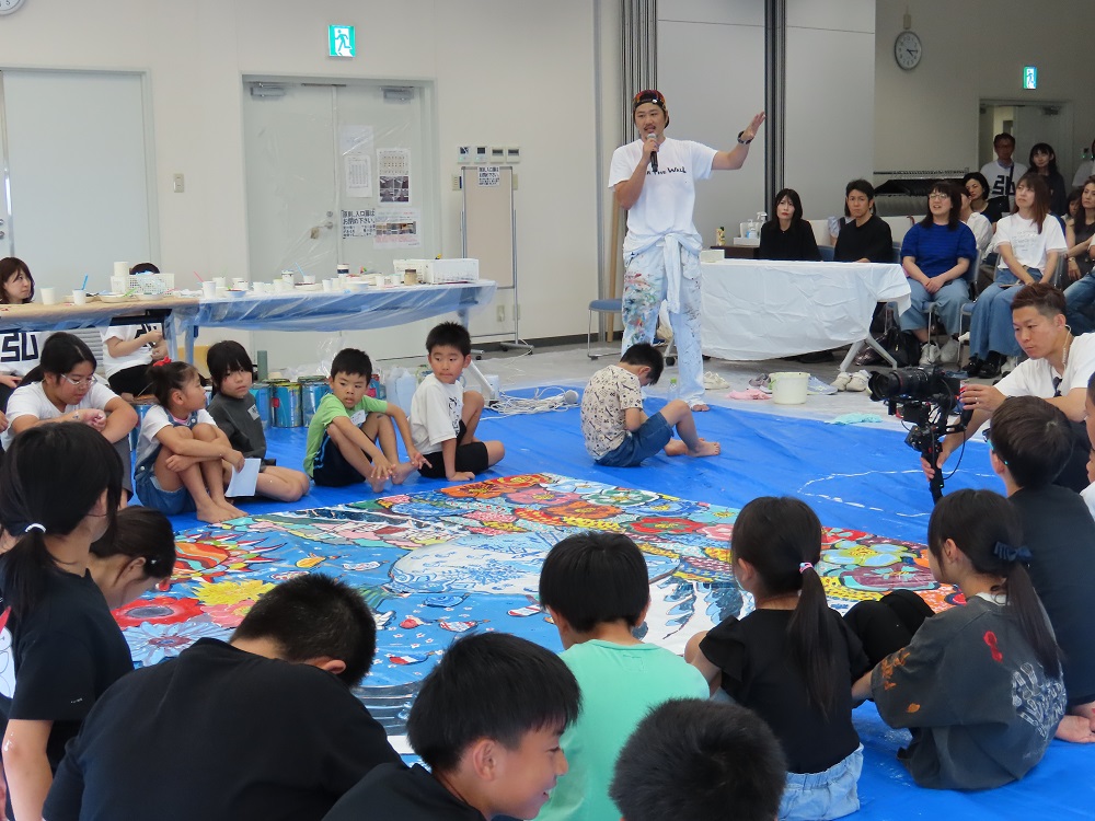 チーム分けは、花や焼き物などのカットを1~2人で集中して描くチームと、花や空など大きなモチーフをみんなと一緒に描くチーム。大きな刷毛で大胆に塗る子もいれば、小さな筆を使い分けて細かく描く子も。ミヤケンさんは、全体を見ながら各パートに向かって「青にもいろんな青があるよ」、「上手に描けなくていいから丁寧に」、「めっちゃいいじゃん!」、「最高!」など、いろんなアドバイスや声掛けをしながら子どもたちのやる気を引き出していました。